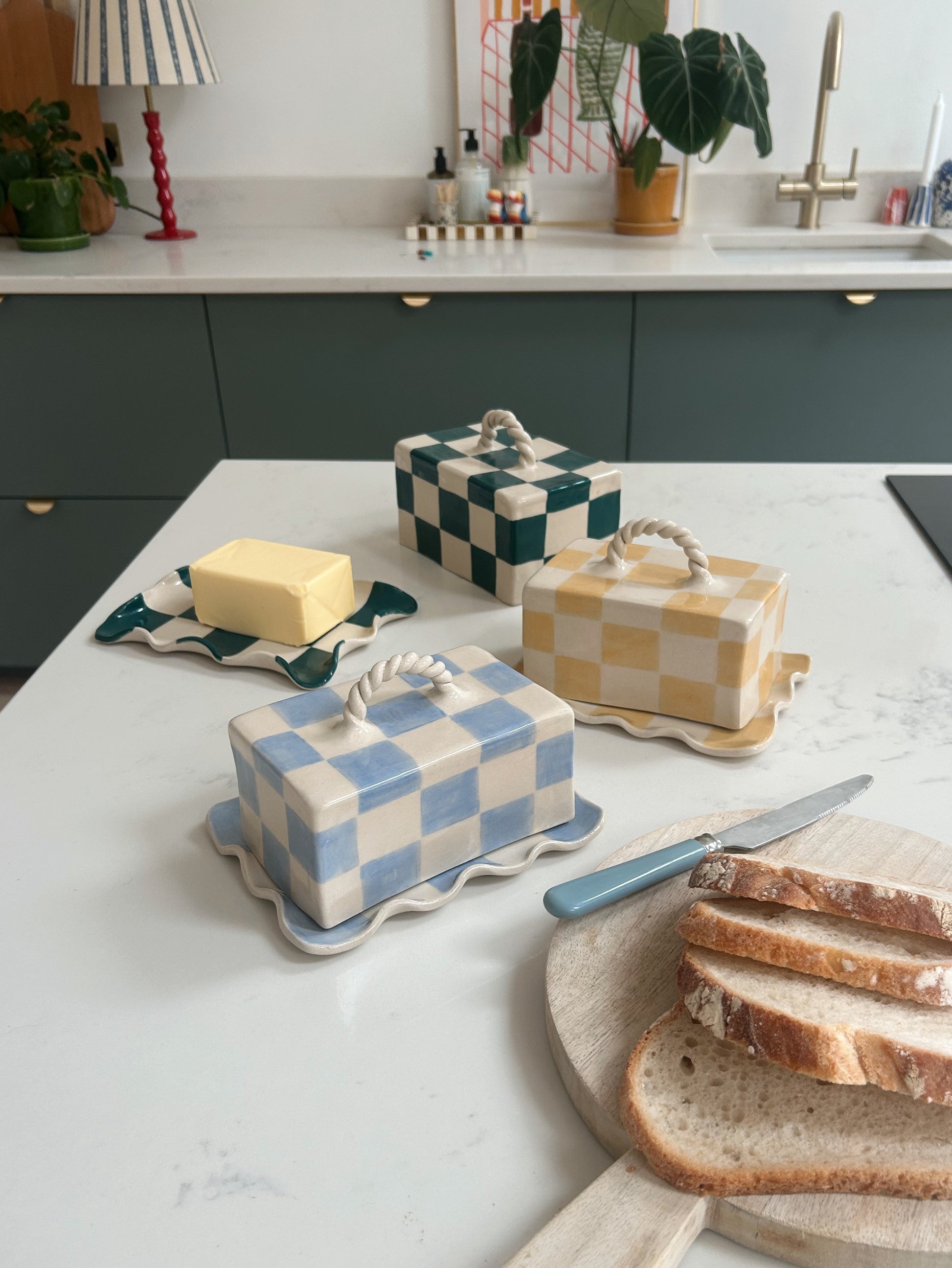 Handbuilt Stoneware butter dishes lovingly handpainted with a checkerboard design. These have been built as heirloom piece designed to be used and treasured for many years. Complete with twisted handle and ruffled base details, each piece has a unique hand-built feel.
