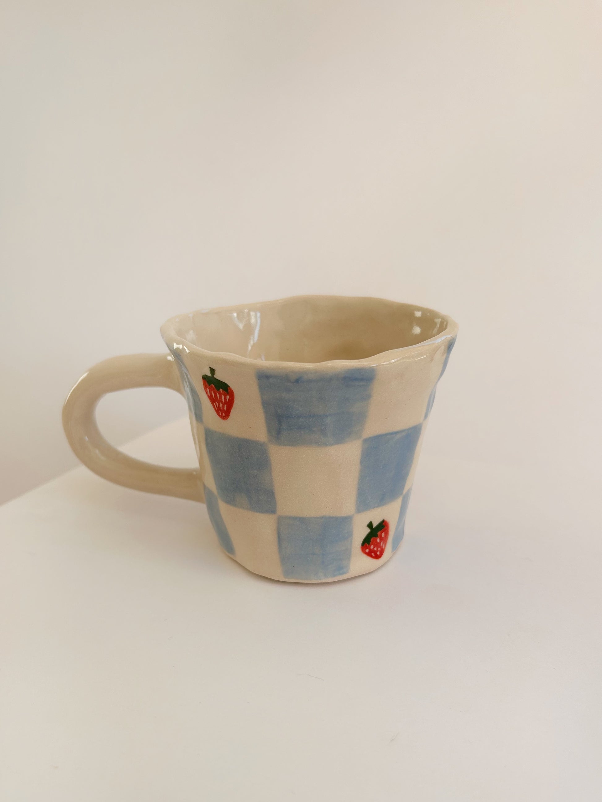 A hand-pinched stoneware mug with a hand-painted strawberry design.