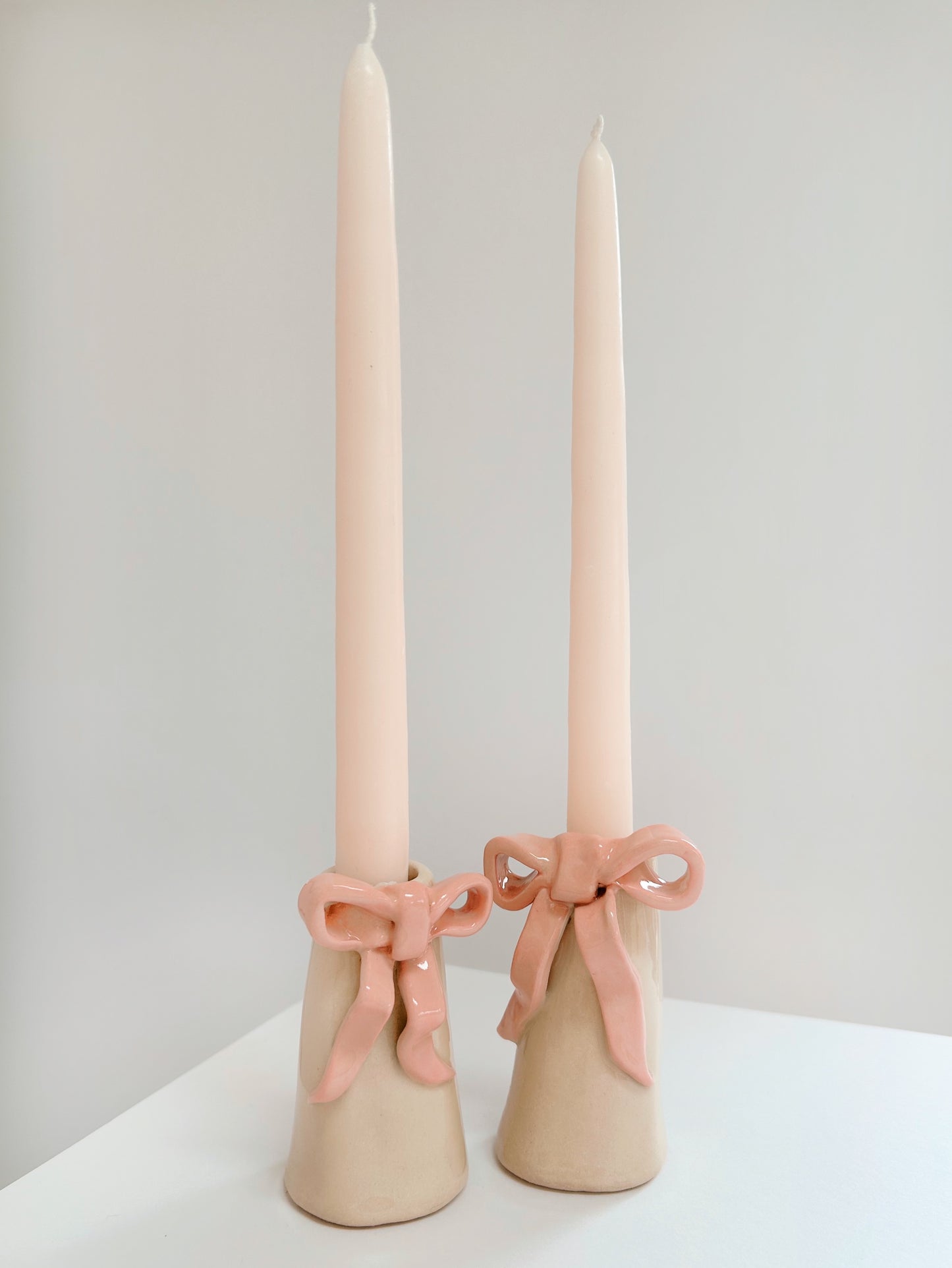 A stoneware candleholder with delicate hand-formed pink bow and a glossy nude glaze.