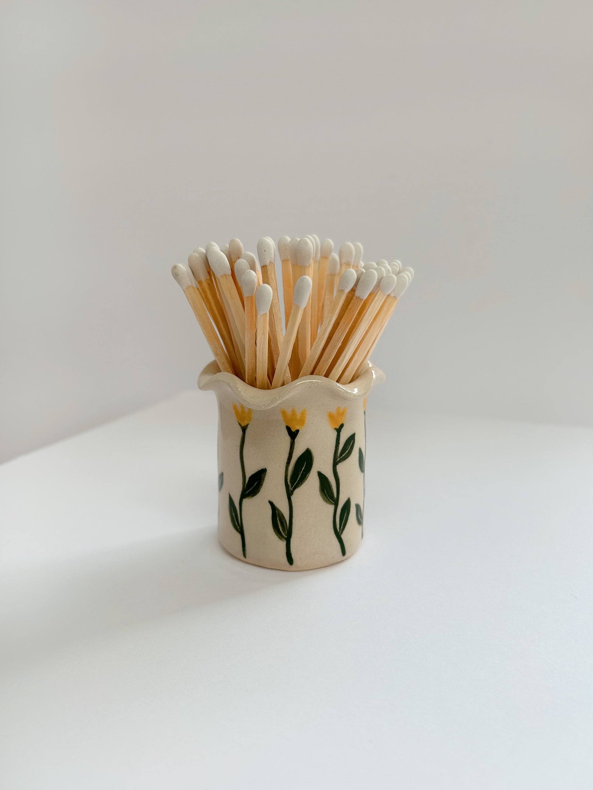 Handcrafted stoneware match holder with a delicate wavy design. Carefully handbuilt using high-quality stoneware which is bisque-fired, hand-painted and then fired for a final time with a glossy nude glaze. Each pot has a match striker on the base so you can easily light your matches.