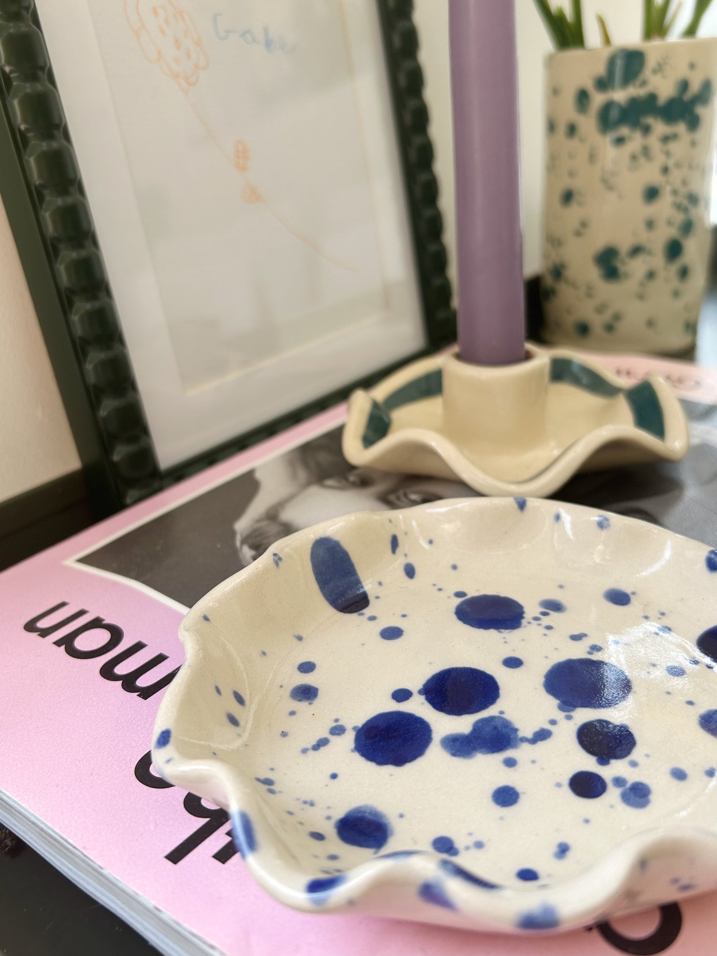 Handcrafted stoneware trinket dish with a decorative wavy design. Carefully handbuilt using high-quality stoneware which is bisque fired, hand-painted and then fired for a final time with a glossy nude glaze.
