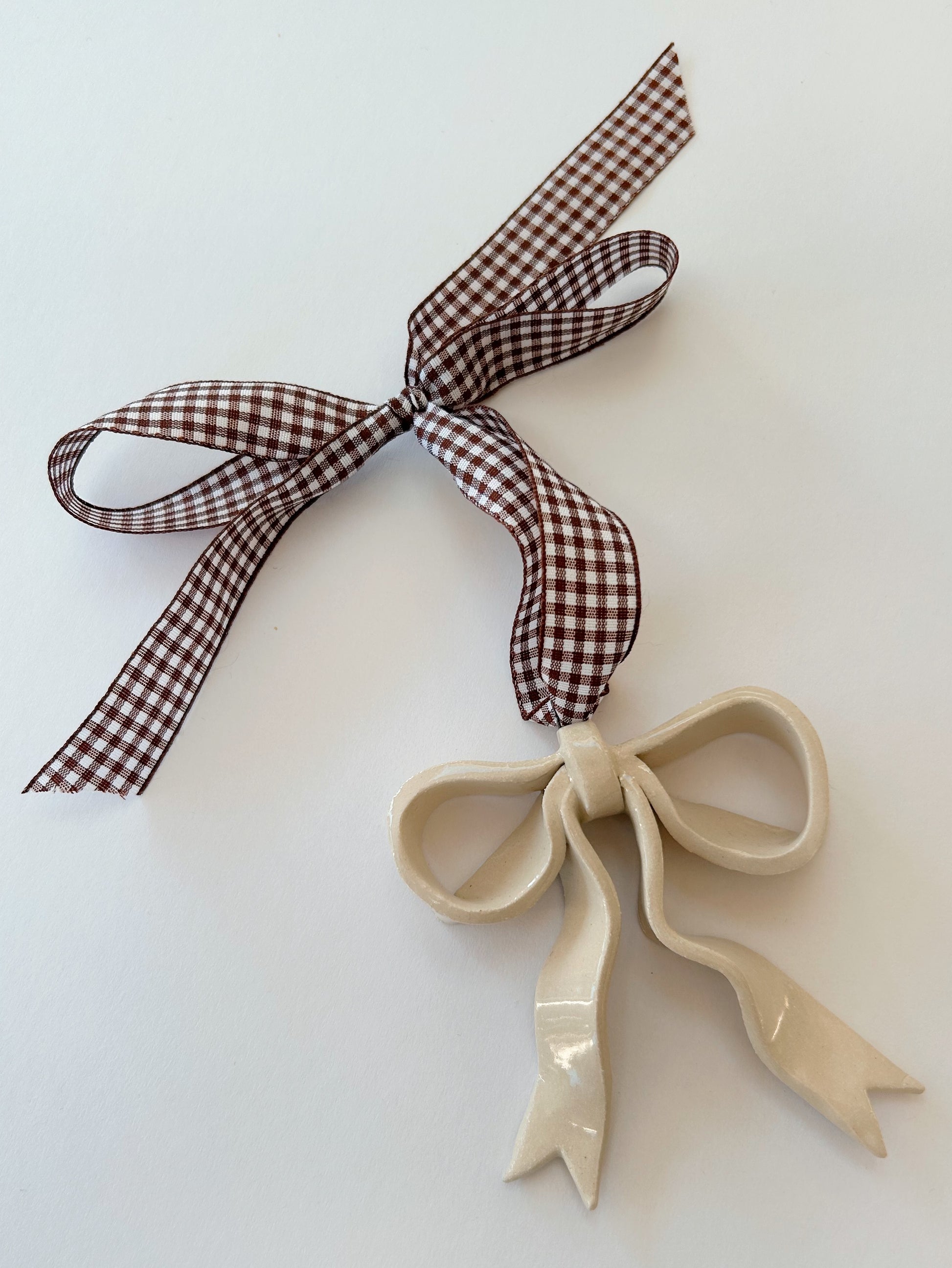 A playful hanging bow ornament made from stoneware clay that is hand-formed, glazed and strung with a ribbon of your choice. It can be hung as a decoration in your home or on your Christmas tree!