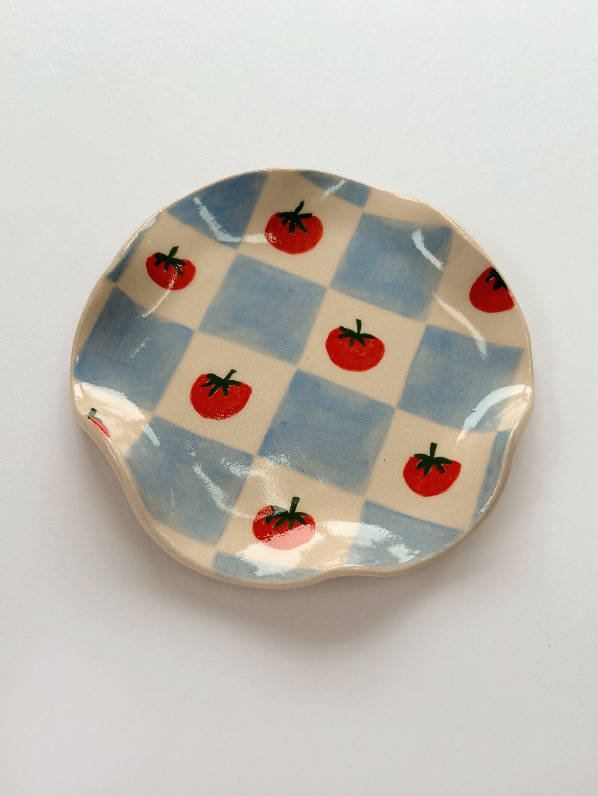 Wavy stoneware trinket dish with a handpainted checkerboard tomato design.