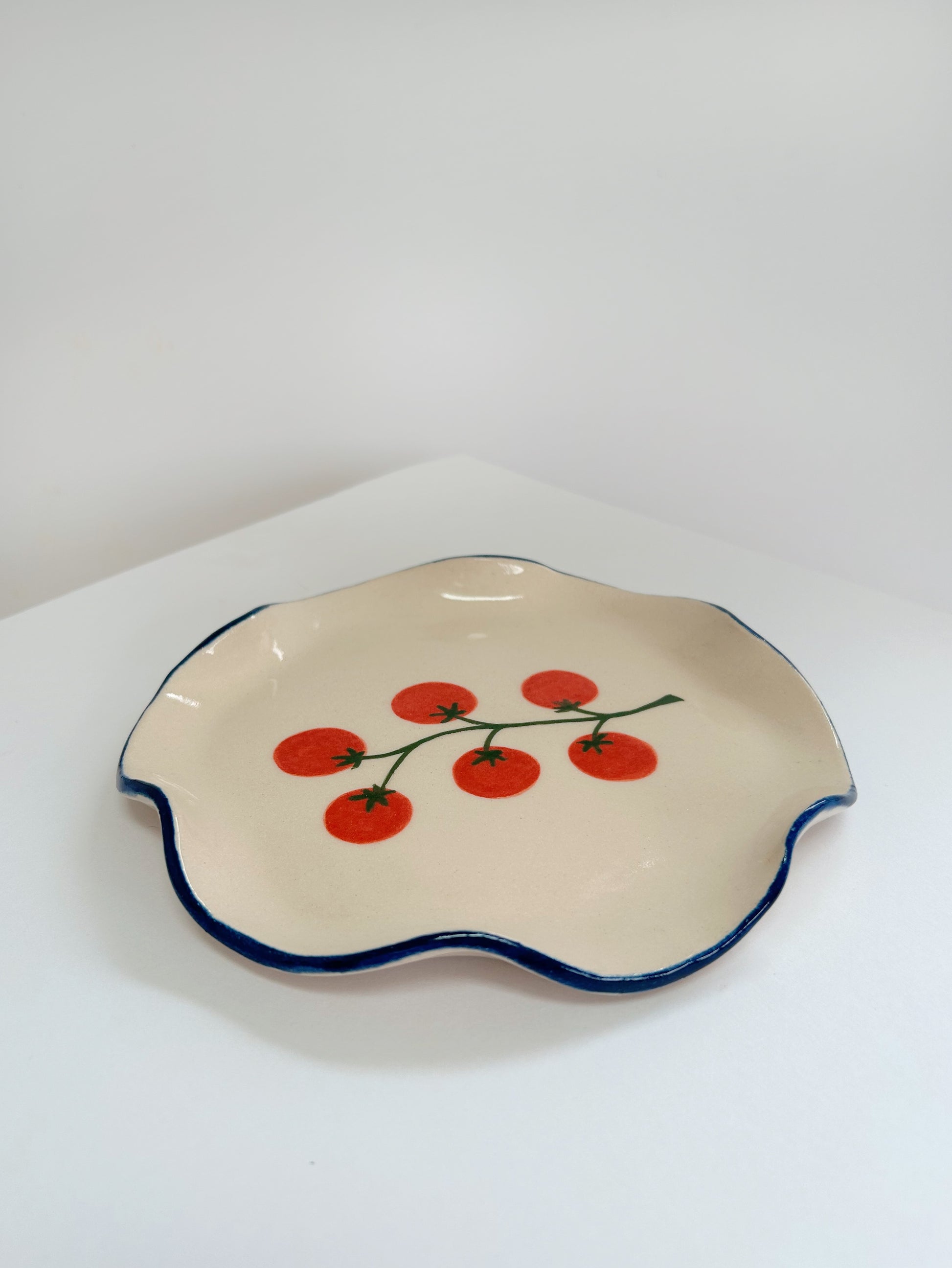 A stoneware trinket plate with decorative ruffled edge. Hand-illustrated with a tomato vine design.